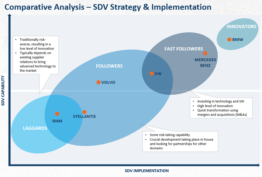 Stellantis, together with other automakers like Renault-Nissan-Mitsubishi (RNM) and Volvo, falls into the “followers” category when it comes to SDV capabilities. While not at the cutting edge of innovation, these automakers are, nevertheless, taking significant steps to catch up with leaders like BMW and Mercedes-Benz. Stellantis’ strategy involves developing domain controller architecture, scheduled for deployment across all its brands starting in 2024. Although this hardware architecture is still under development, the company is laying the groundwork to scale its SDV capabilities across its diverse vehicle portfolio.