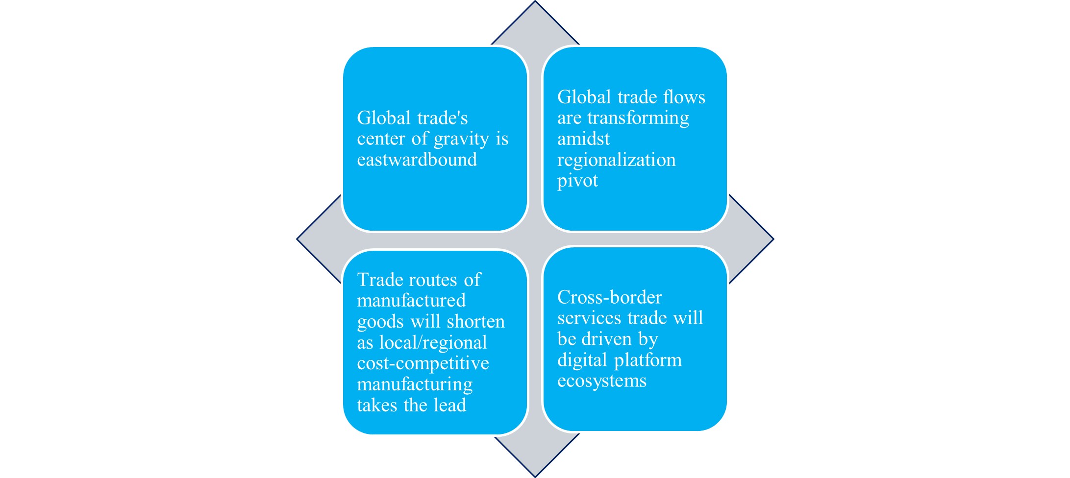 Global corporations must account for some of the long-term trends significantly impacting the global trade landscape. For instance, Eastern geographies including Africa, Middle East, and Asia will become export hubs of the future, regionalization focus will see the emergence of highly integrated regional trade corridors, and as local/regional cost-effective manufacturing ecosystems cement themselves, the manufactured goods’ trade routes will be shortened. Multi-sector growth opportunities spanning across regions will emerge from such unprecedented trade dynamism and companies which leverage these transformations to drive real-time decisions are bound to remain ahead of the curve.